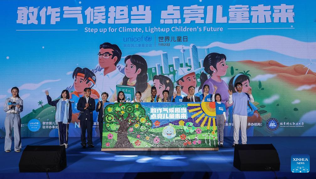 Guests and children attend an event themed "Step up for Climate, Light up Children's Future," to mark World Children's Day, in Beijing, capital of China, Nov. 20, 2025. (Xinhua/Zhang Yuwei)