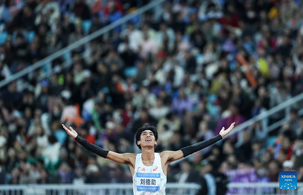 Liu Dezhu of Guangxi reacts after the men's 1500m final of athletics at China's 15th National Games in Guangzhou, south China's Guangdong Province, Nov. 20, 2025. (Xinhua/Huang Wei)