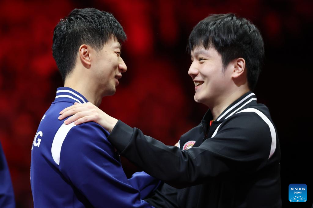 Fan Zhendong (R) of Shanghai and Ma Long of Beijing greet each other after the men's team final of table tennis between Beijing and Shanghai at China's 15th National Games in Macao, south China, Nov. 20, 2025. (Xinhua/Liu Xu)