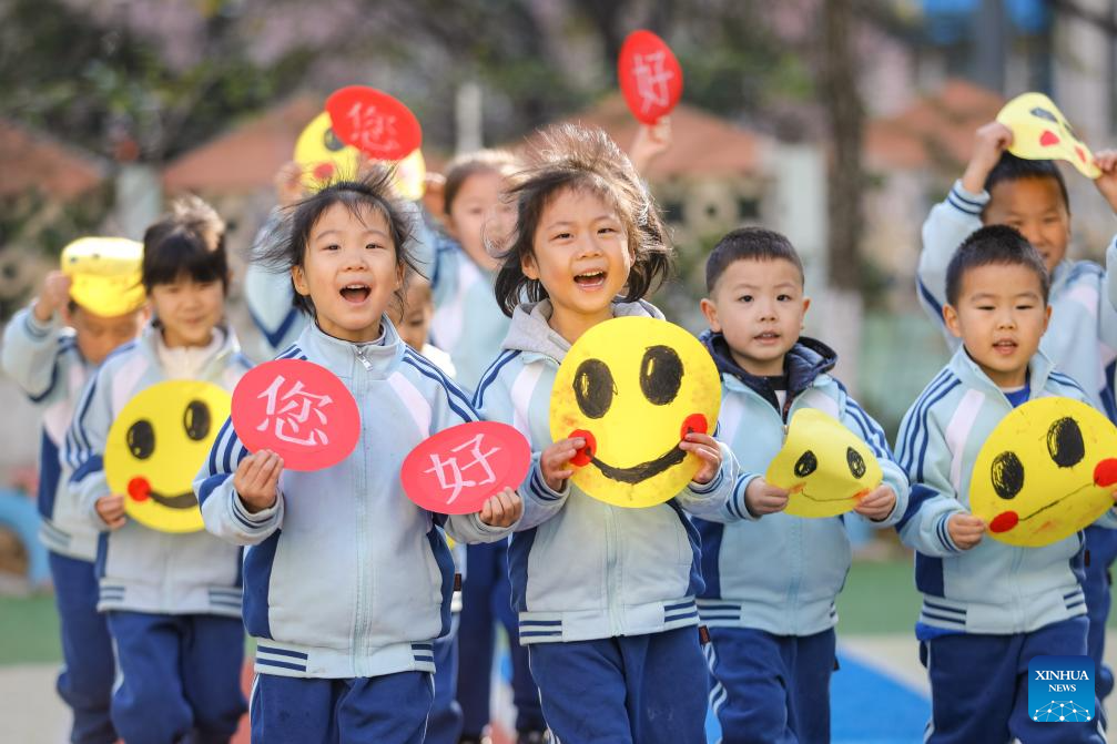 Children show emoji and greeting cards to celebrate World Hello Day, which falls on Nov. 21 annually, at a kindergarten in Qingdao, east China's Shandong Province, Nov. 20, 2025. (Photo by Zhang Ying/Xinhua)
