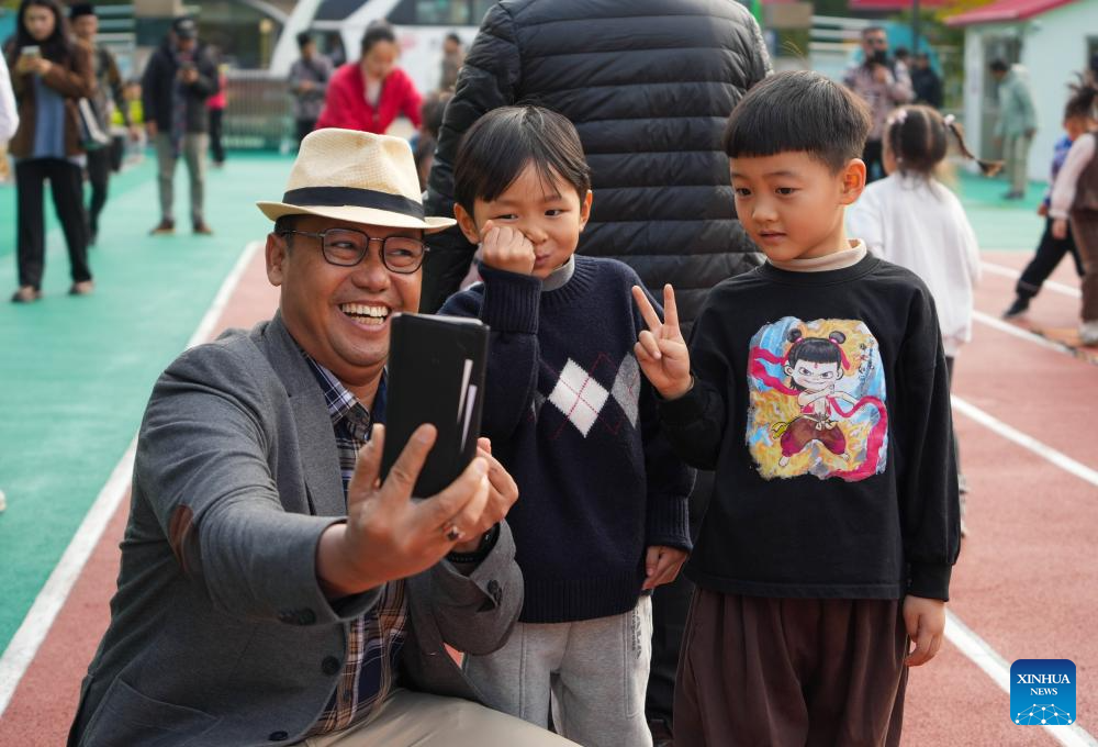 A member of the fifth session of the Indonesian Rural Cadre Training Program takes selfies with children at a kindergarten in Longkou, east China's Shandong Province, Nov. 4, 2025. (Xinhua/Xu Suhui)