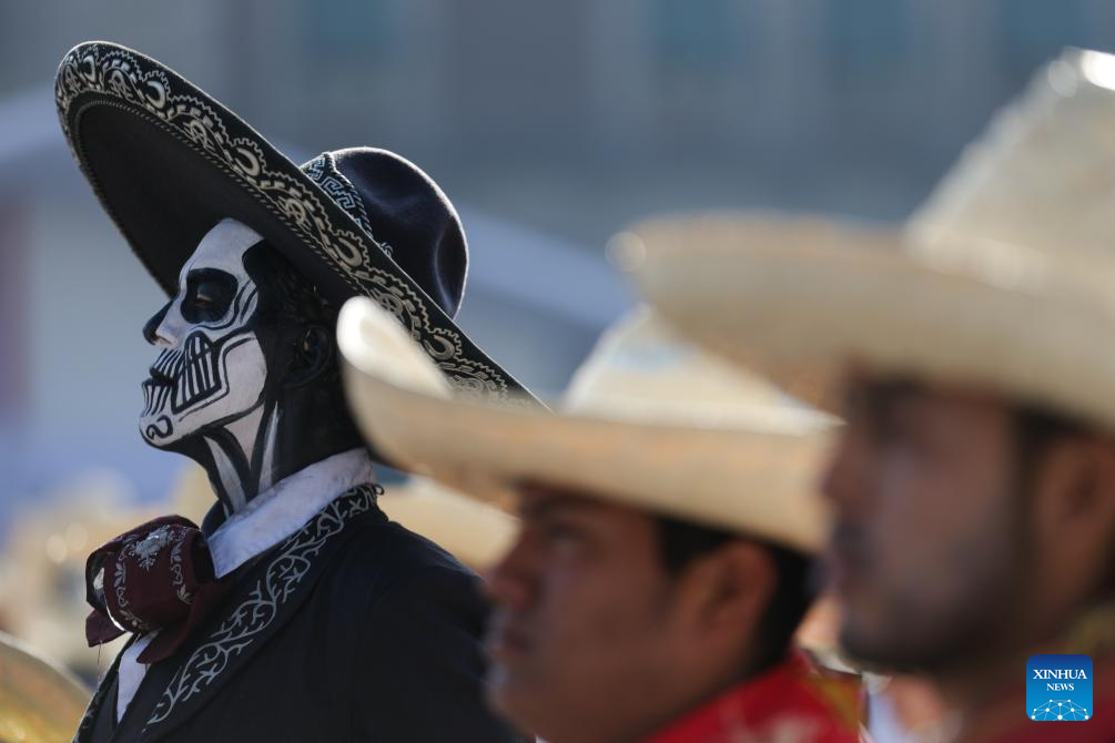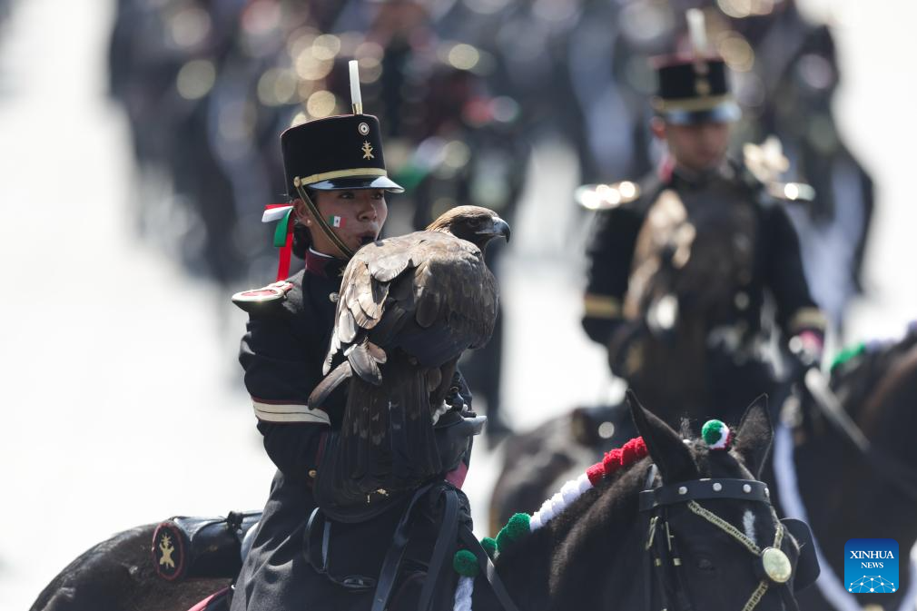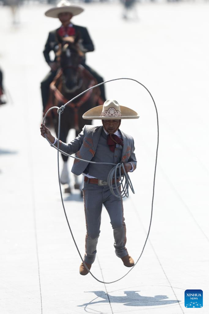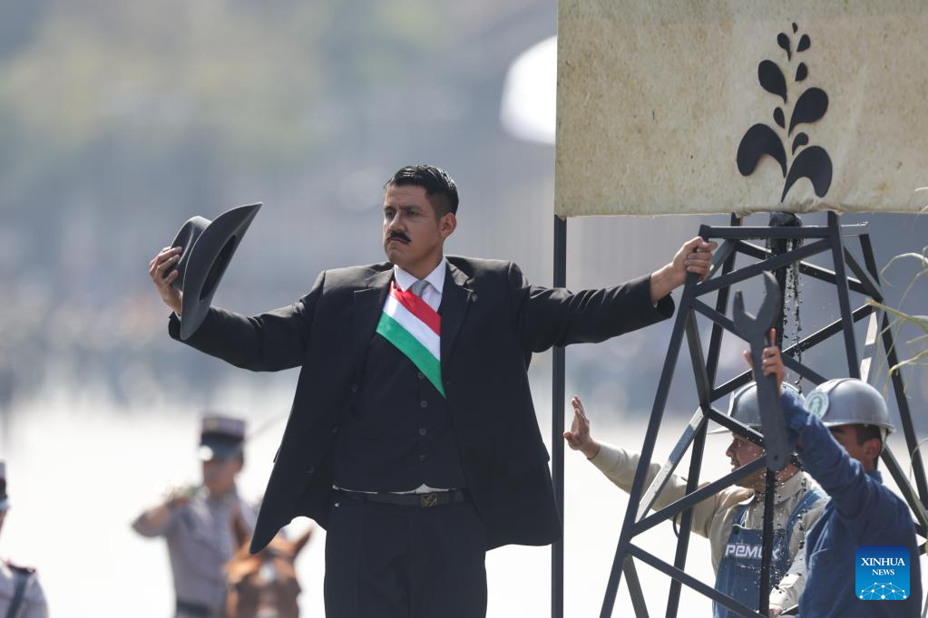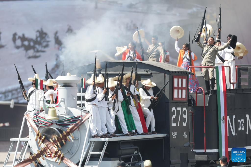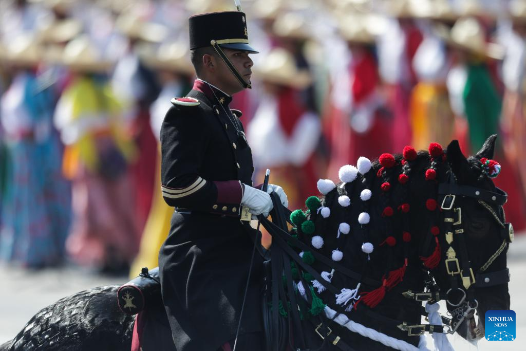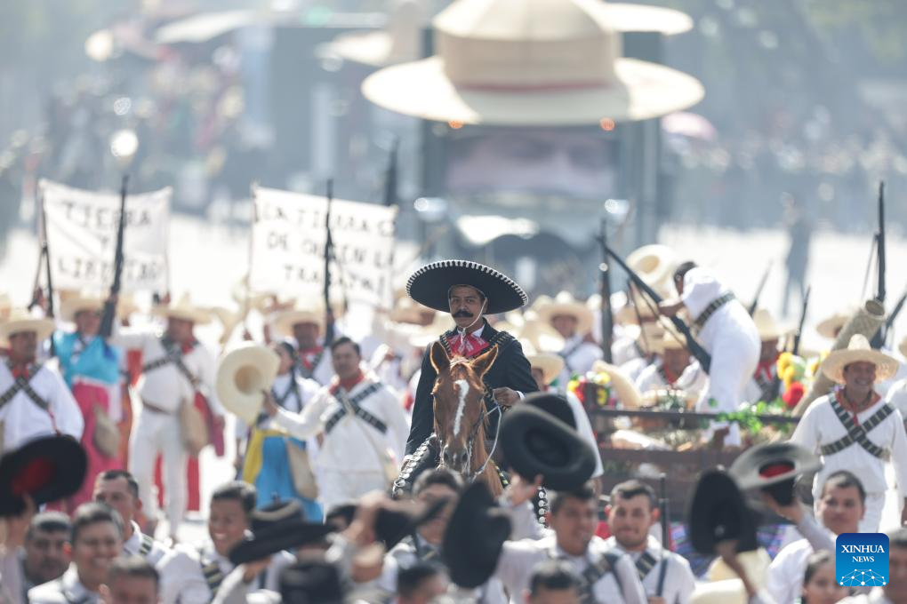 People take part in the commemoration ceremony of the 115th anniversary of the Mexican Revolution at Zocalo Square in Mexico City, Mexico, Nov. 20, 2025. (Xinhua/Francisco Canedo)