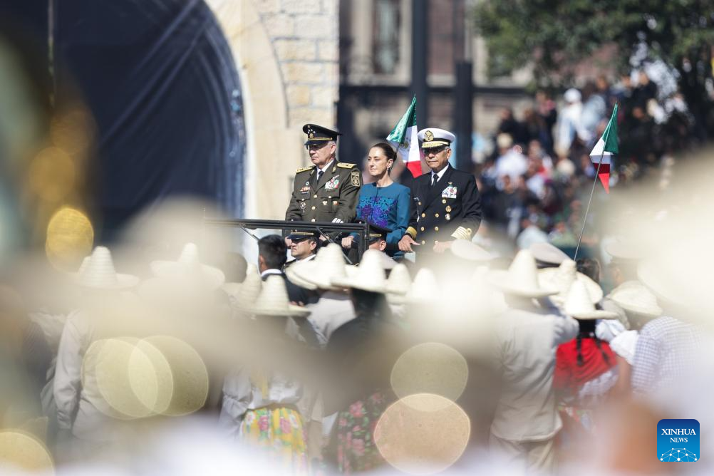 Mexican President Claudia Sheinbaum (C) takes part in the commemoration ceremony of the 115th anniversary of the Mexican Revolution at Zocalo Square in Mexico City, Mexico, Nov. 20, 2025. (Xinhua/Francisco Canedo)