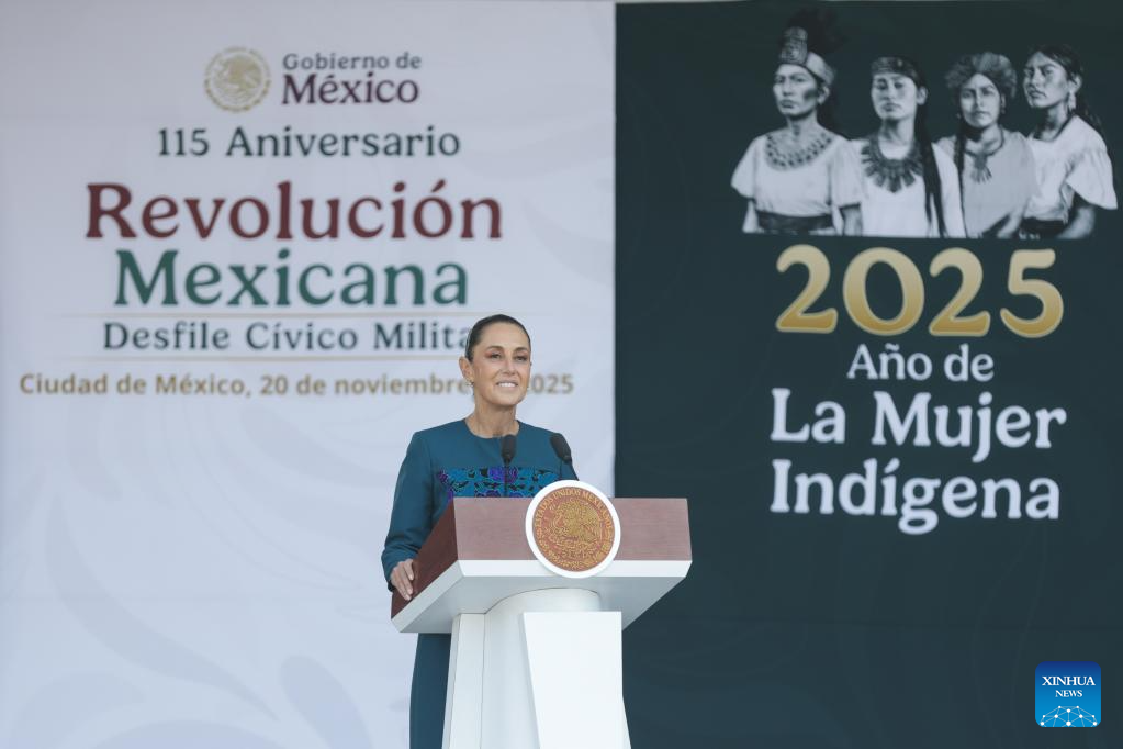 Mexican President Claudia Sheinbaum speaks during the commemoration ceremony of the 115th anniversary of the Mexican Revolution at Zocalo Square in Mexico City, Mexico, Nov. 20, 2025. (Xinhua/Francisco Canedo)