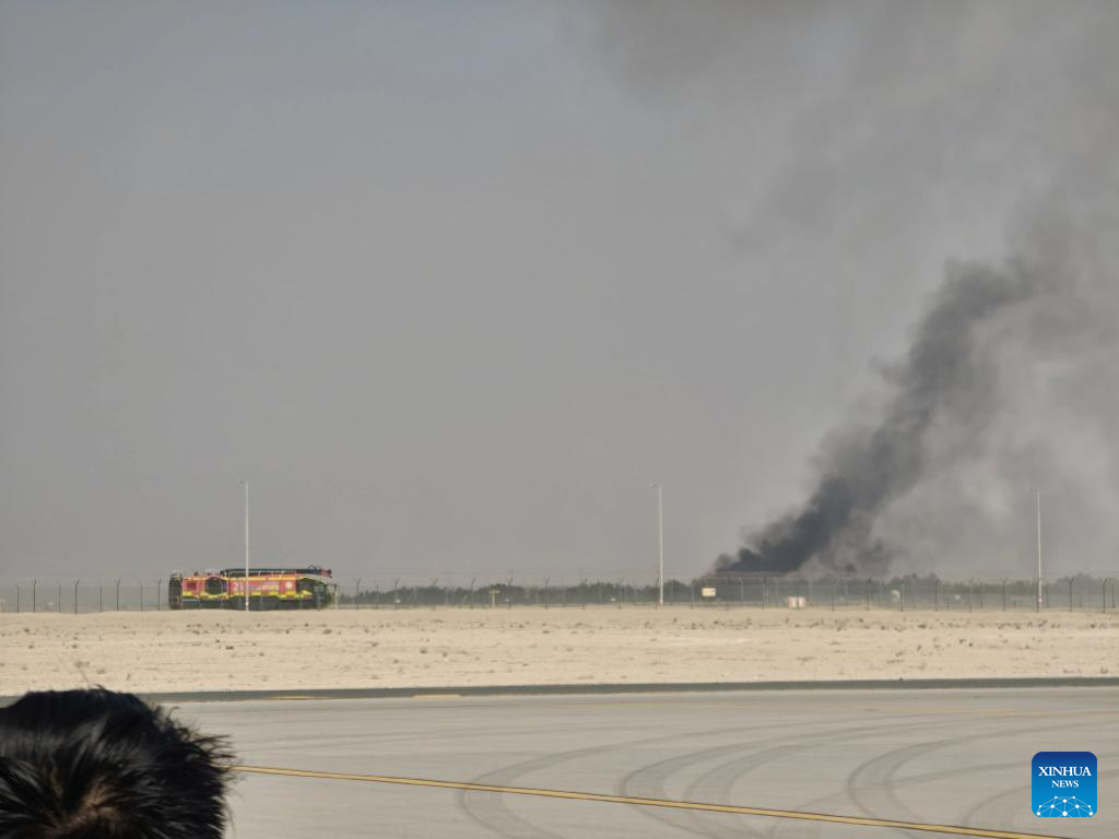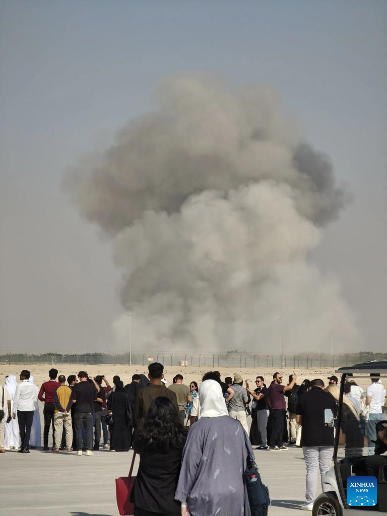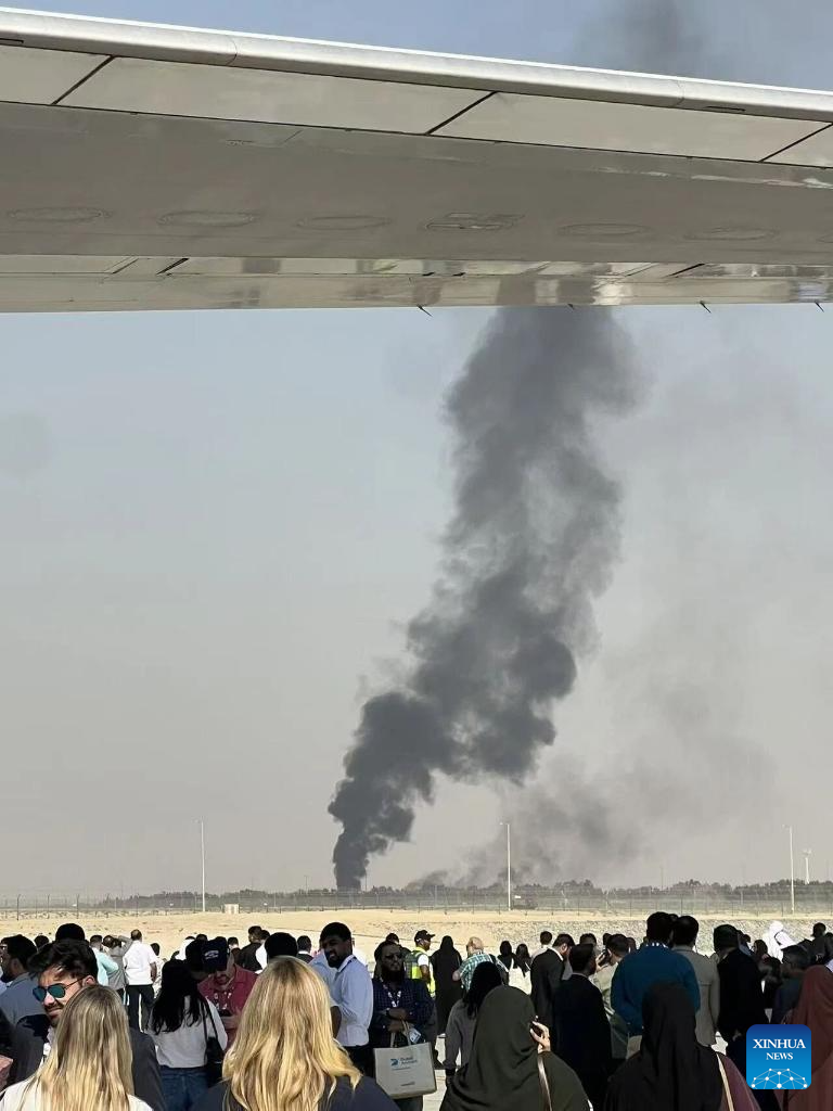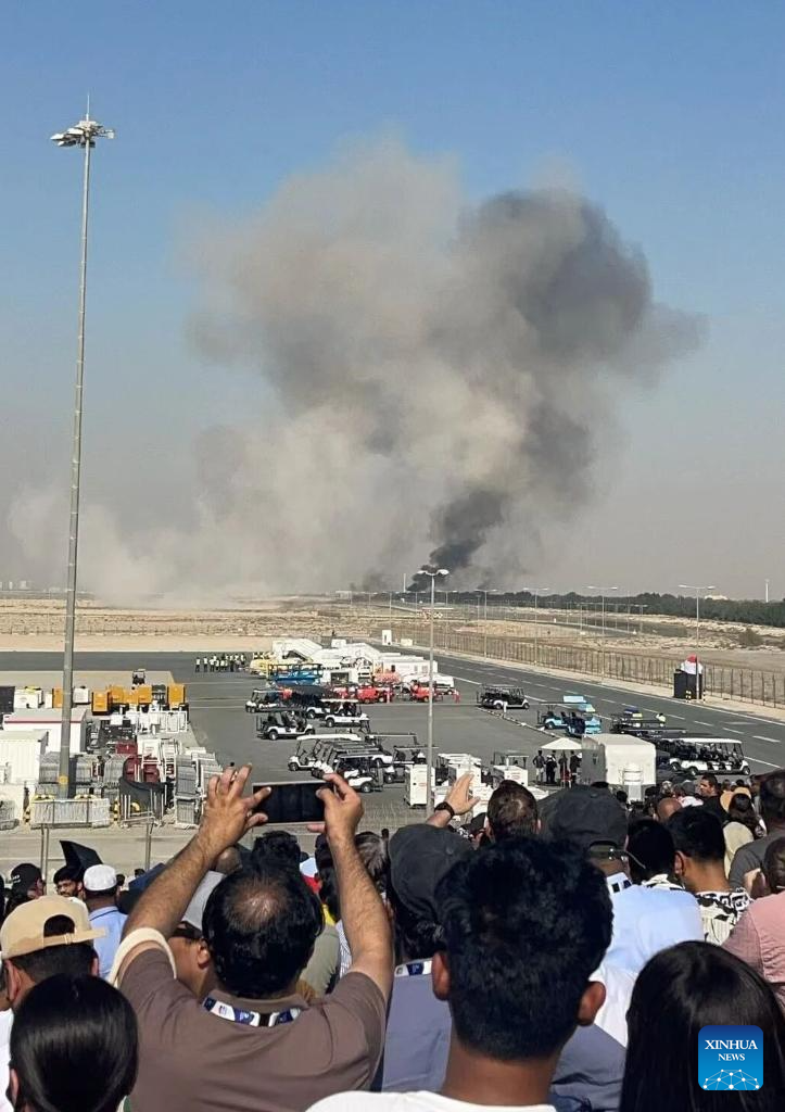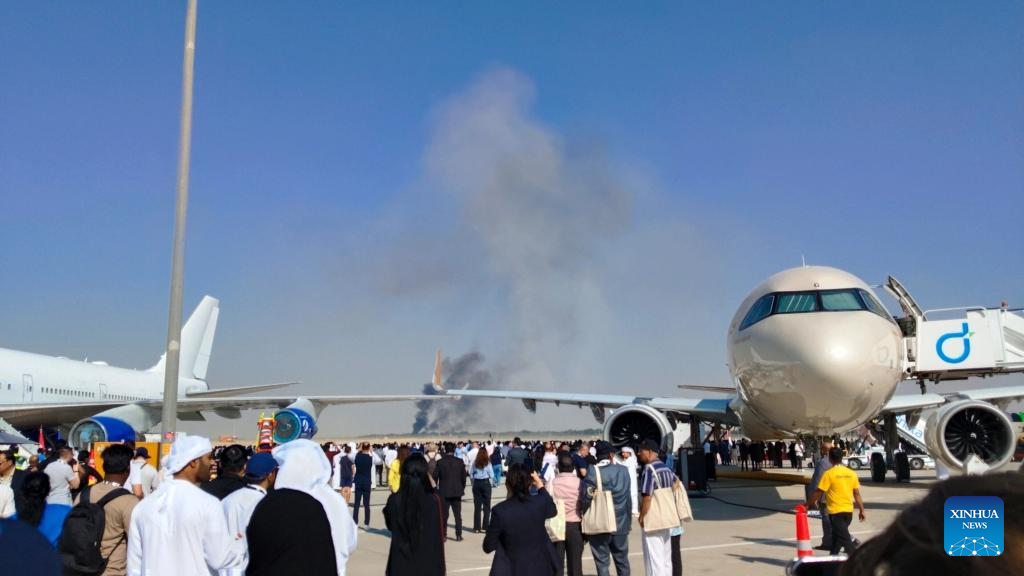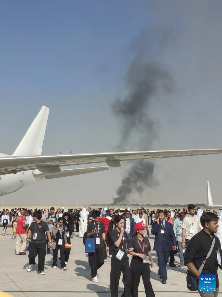 Smoke billows from the site of an aircraft crash during a demonstration at the Dubai Air Show in Dubai, the United Arab Emirates (UAE), Nov. 21, 2025. An Indian aircraft crashed on Friday during a demonstration at the Dubai Air Show, killing the pilot. The Indian HAL Tejas fighter jet crashed around 2:10 p.m. local time (1010 GMT) while flying a demonstration flight. (Xinhua)