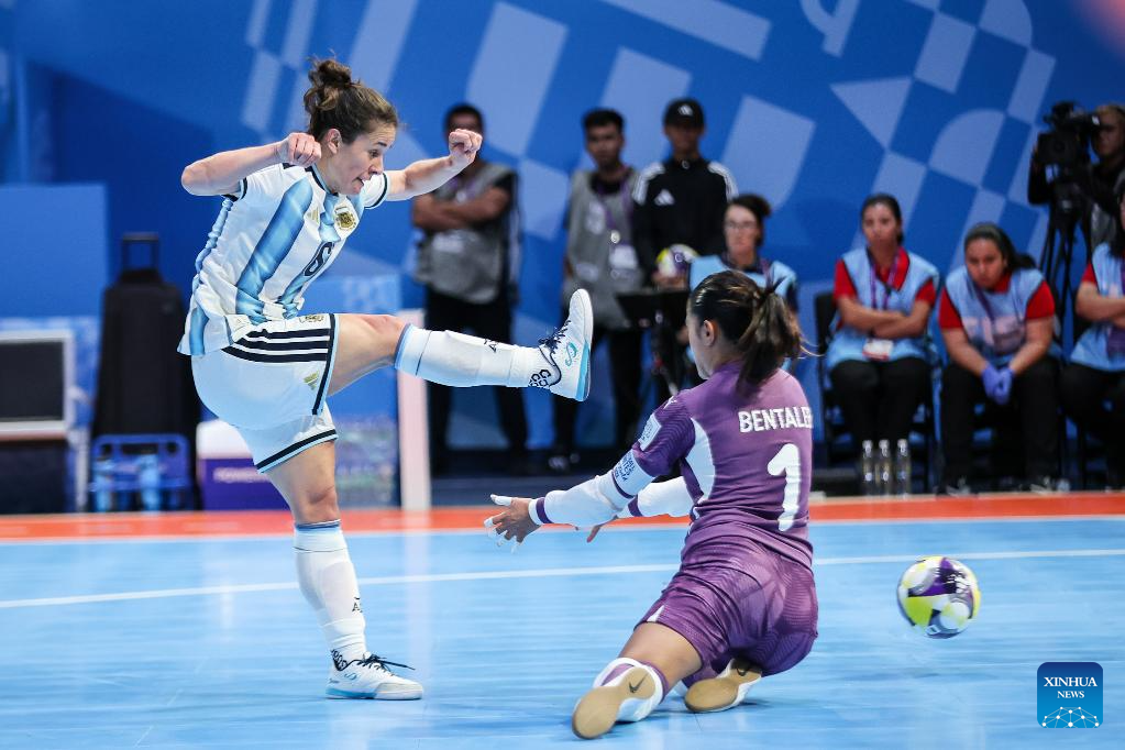 Melina Quevedo (L) of Argentina shoots against Kawtar Bentaleb of Morocco during the match between Argentina and Morocco at the FIFA Futsal Women's World Cup 2025 in Pasig City, the Philippines, Nov. 21, 2025. (Xinhua/Rouelle Umali)