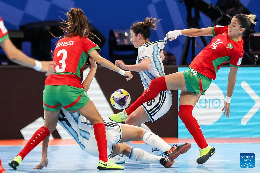 Ana Ontiveros (bottom C) of Argentina competes against players of Morocco during the match between Argentina and Morocco at the FIFA Futsal Women's World Cup 2025 in Pasig City, the Philippines, Nov. 21, 2025. (Xinhua/Rouelle Umali)
