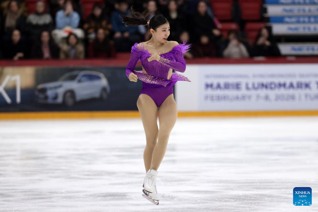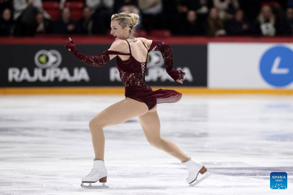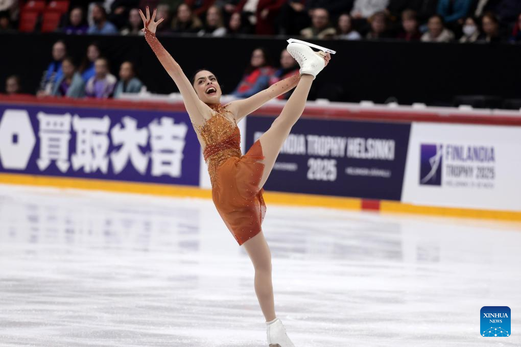 Iida Karhunen of Finland performs during the women's short program at ISU Figure Skating Grand Prix 2025 in Helsinki, Finland, Nov. 21, 2025. (Photo by Matti Matikainen/Xinhua)