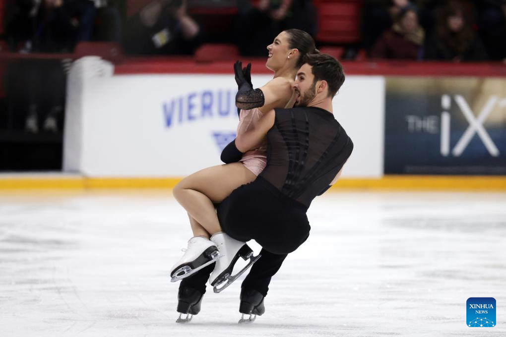 Laurence Fournier Beaudry/Guillaume Cizeron (R) of France perform during the ice dance rhythm dance at ISU Figure Skating Grand Prix 2025 in Helsinki, Finland, Nov. 21, 2025. (Photo by Matti Matikainen/Xinhua)