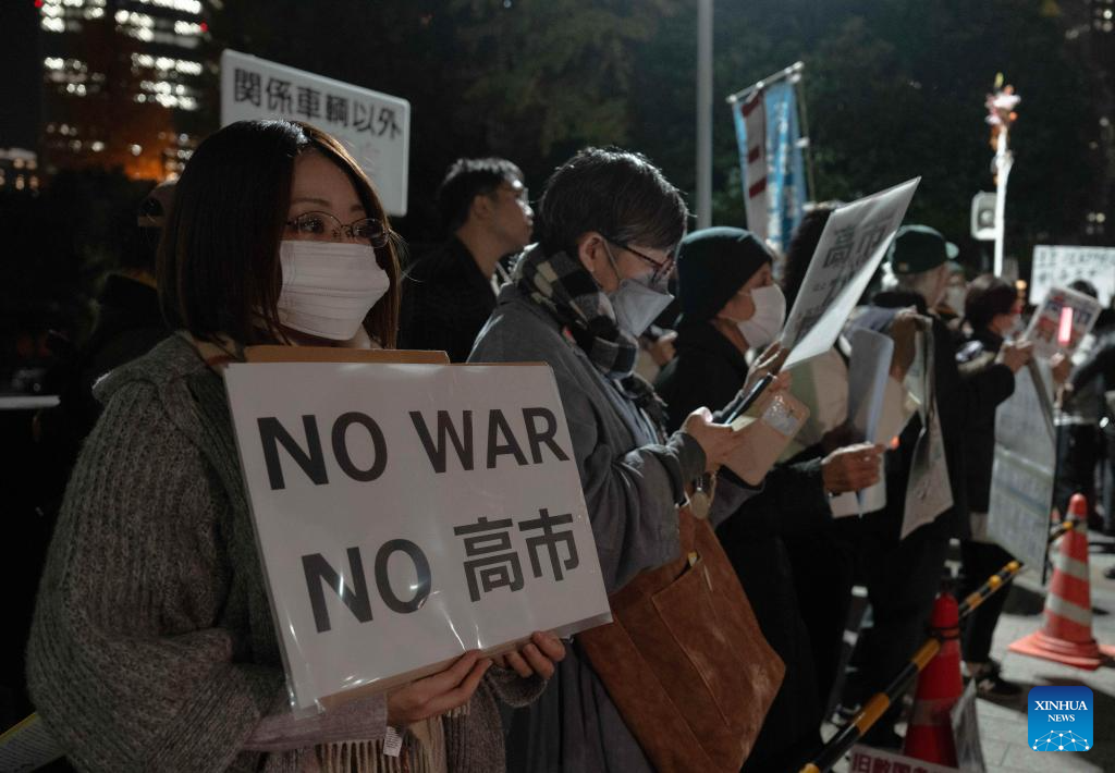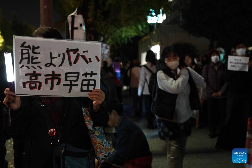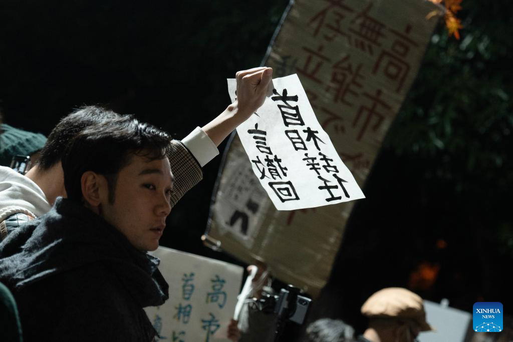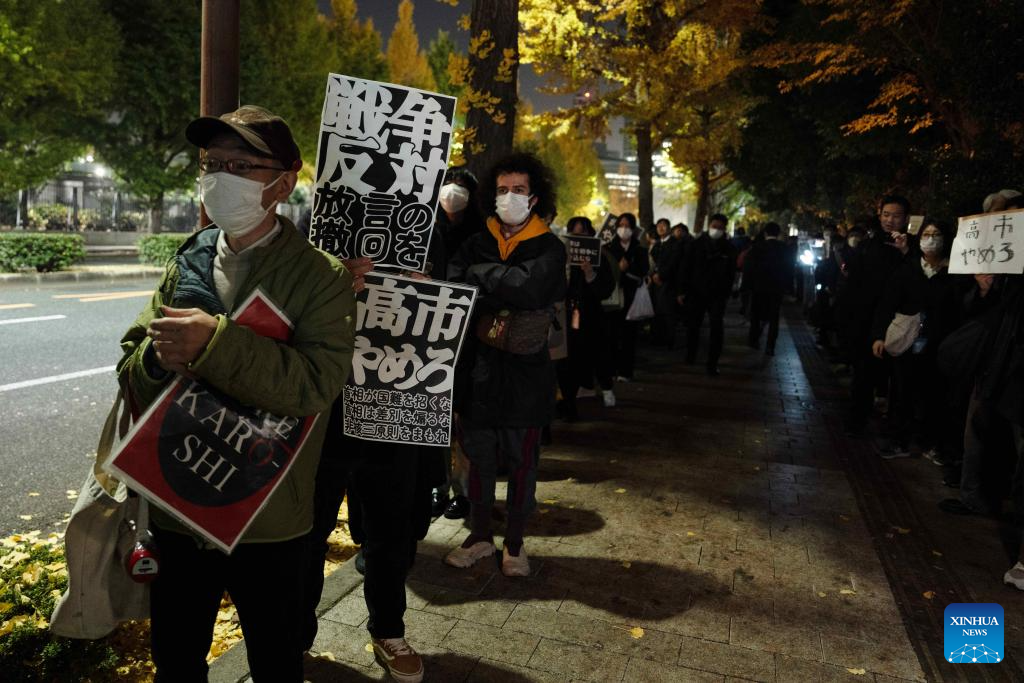 TOKYO, Nov. 22 (Xinhua) -- Hundreds of Japanese people held a protest in front of the prime minister's official residence in Tokyo on Friday, demanding that Prime Minister Sanae Takaichi retract her recent erroneous remarks on Taiwan and offer an explanation and apology.