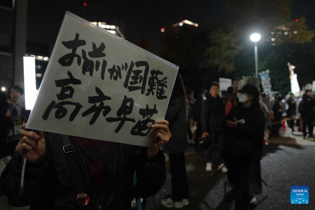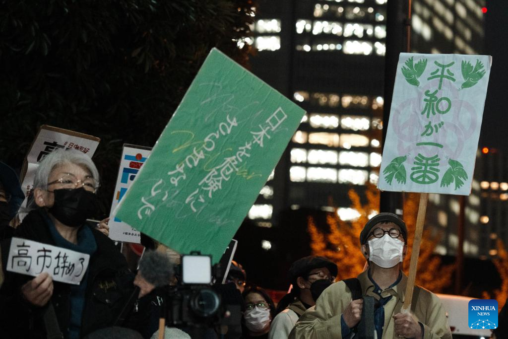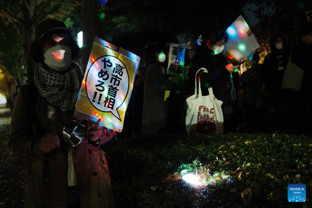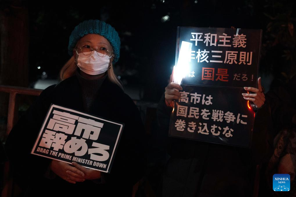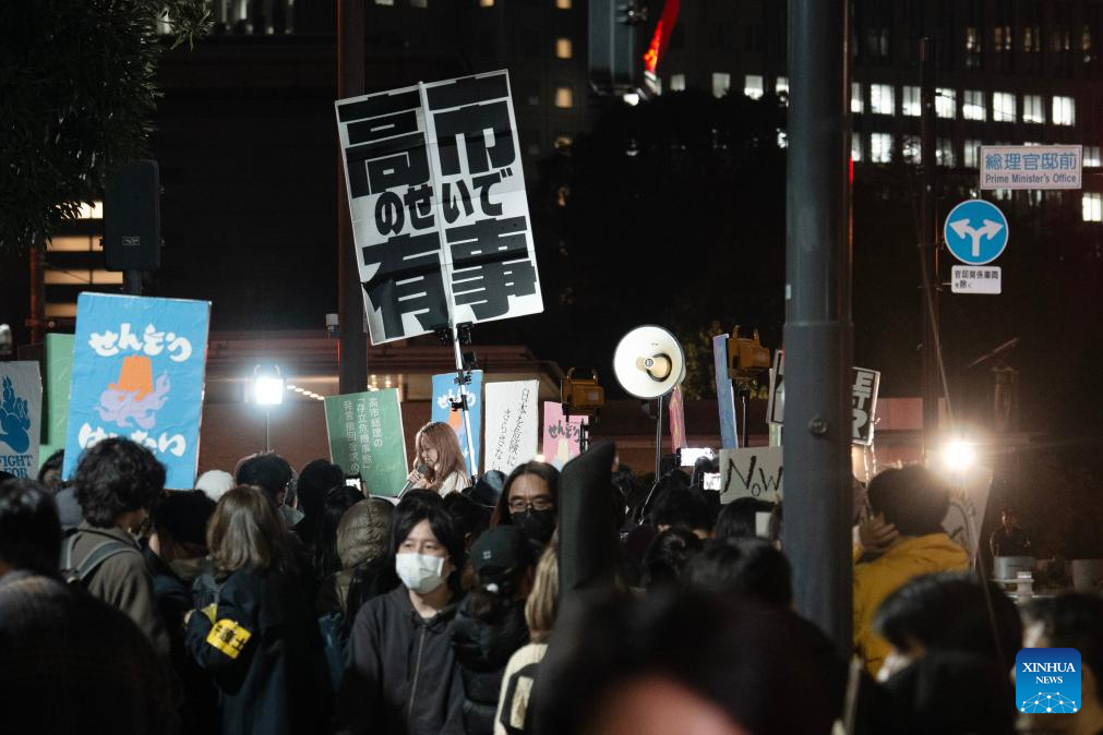 TOKYO, Nov. 22 (Xinhua) -- Hundreds of Japanese people held a protest in front of the prime minister's official residence in Tokyo on Friday, demanding that Prime Minister Sanae Takaichi retract her recent erroneous remarks on Taiwan and offer an explanation and apology.