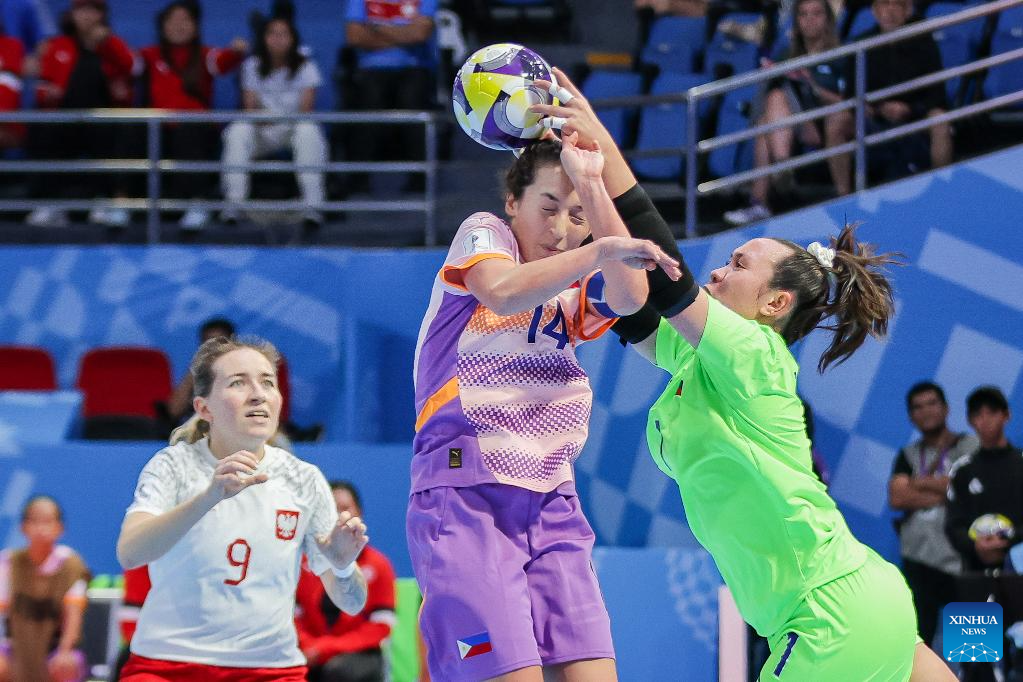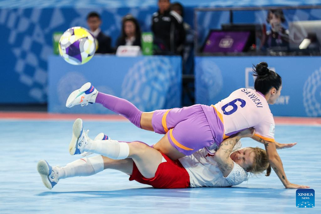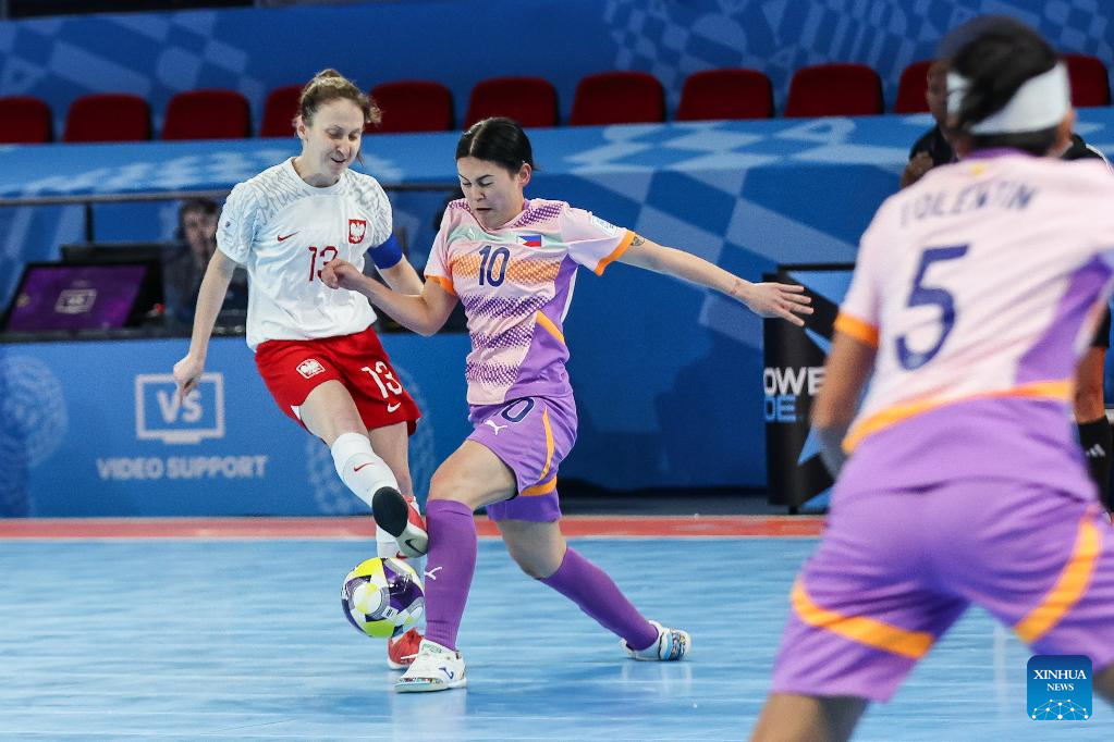 Katarzyna Wlodarczyk (L) of Poland vies against Judy Connolly of the Philippines during the match between Poland and the Philippines at the FIFA Futsal Women's World Cup 2025 in Pasig City, the Philippines, Nov. 21, 2025. (Xinhua/Rouelle Umali)