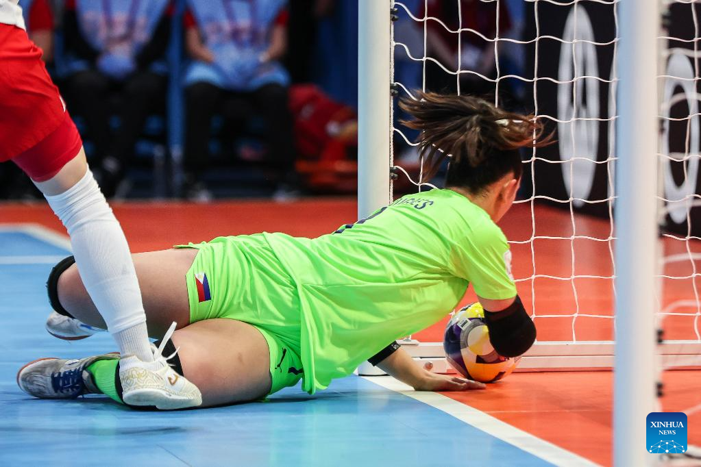 Goalkeeper Samantha Hughes of the Philippines fails to save the ball during the match between Poland and the Philippines at the FIFA Futsal Women's World Cup 2025 in Pasig City, the Philippines, Nov. 21, 2025. (Xinhua/Rouelle Umali)