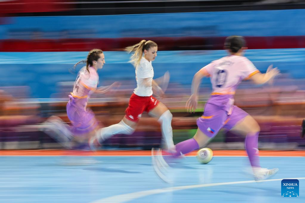 Aga Bala (C) of Poland breaks through during the match between Poland and the Philippines at the FIFA Futsal Women's World Cup 2025 in Pasig City, the Philippines, Nov. 21, 2025. (Xinhua/Rouelle Umali)