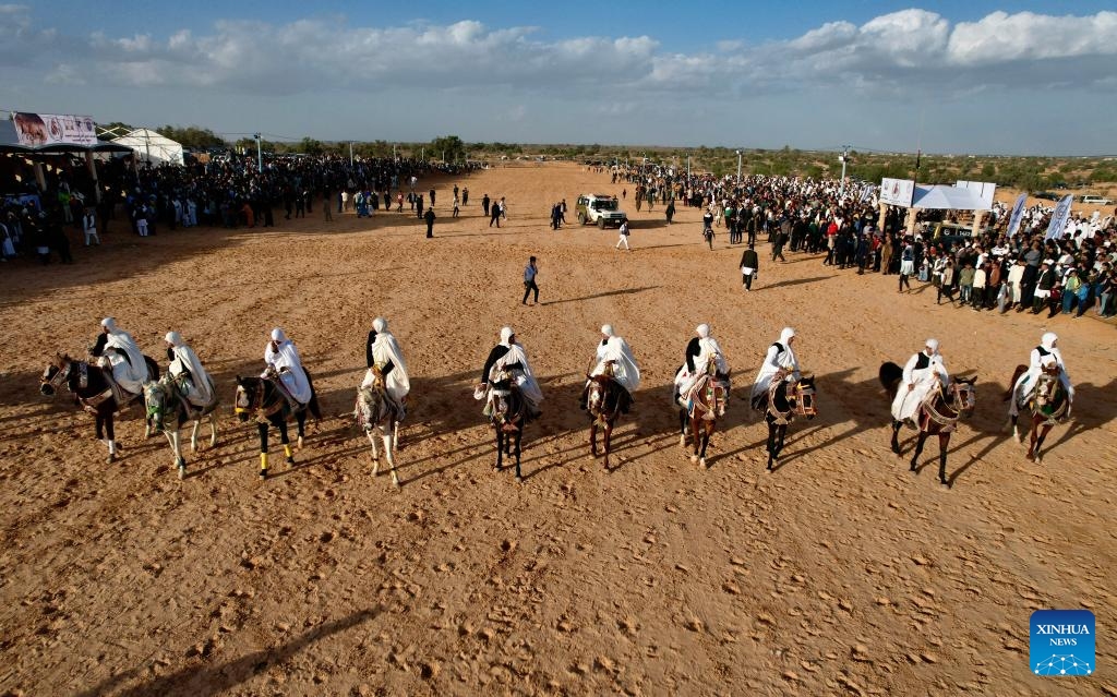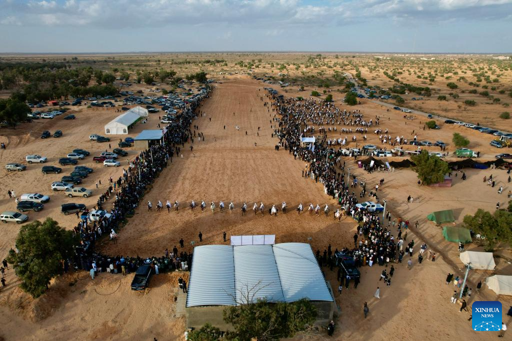 A drone photo shows riders racing their horses at the Zelten traditional equestrian festival in Zelten, Libya, on Nov. 21, 2025. The festival, held from Nov. 21 to 22, aimed to promote the local traditional equestrian culture. (Photo by Hazem Turkia/Xinhua)