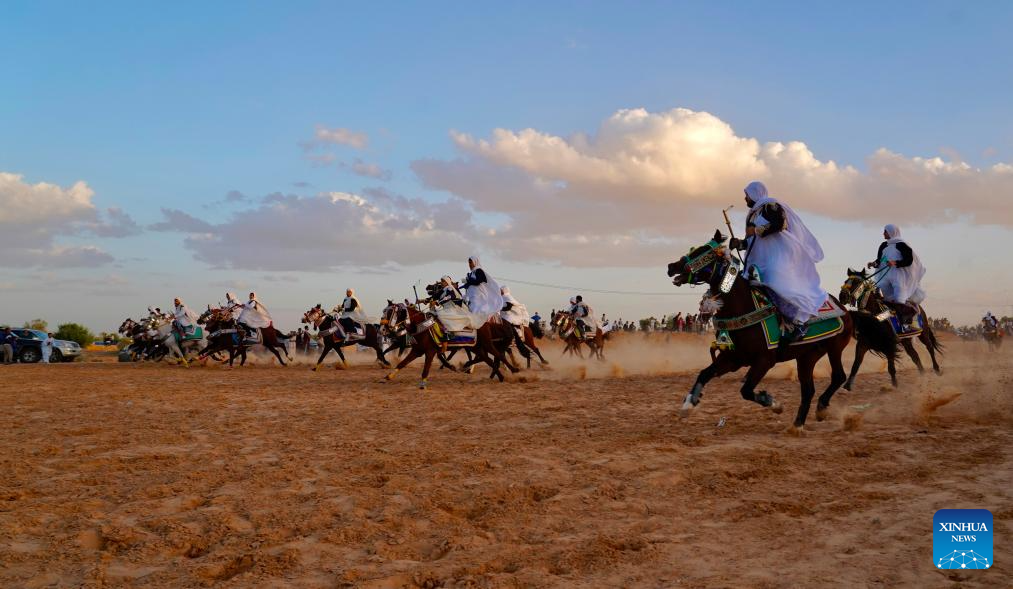 Riders race their horses at the Zelten traditional equestrian festival in Zelten, Libya, on Nov. 21, 2025. The festival, held from Nov. 21 to 22, aimed to promote the local traditional equestrian culture. (Photo by Hazem Turkia/Xinhua)