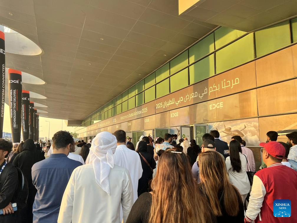 People visit the Dubai Air Show where air performances have resumed after being suspended due to an Indian aircraft crash in Dubai, the United Arab Emirates (UAE), Nov. 21, 2025. An Indian aircraft crashed on Friday during a demonstration at the Dubai Air Show, killing the pilot.
