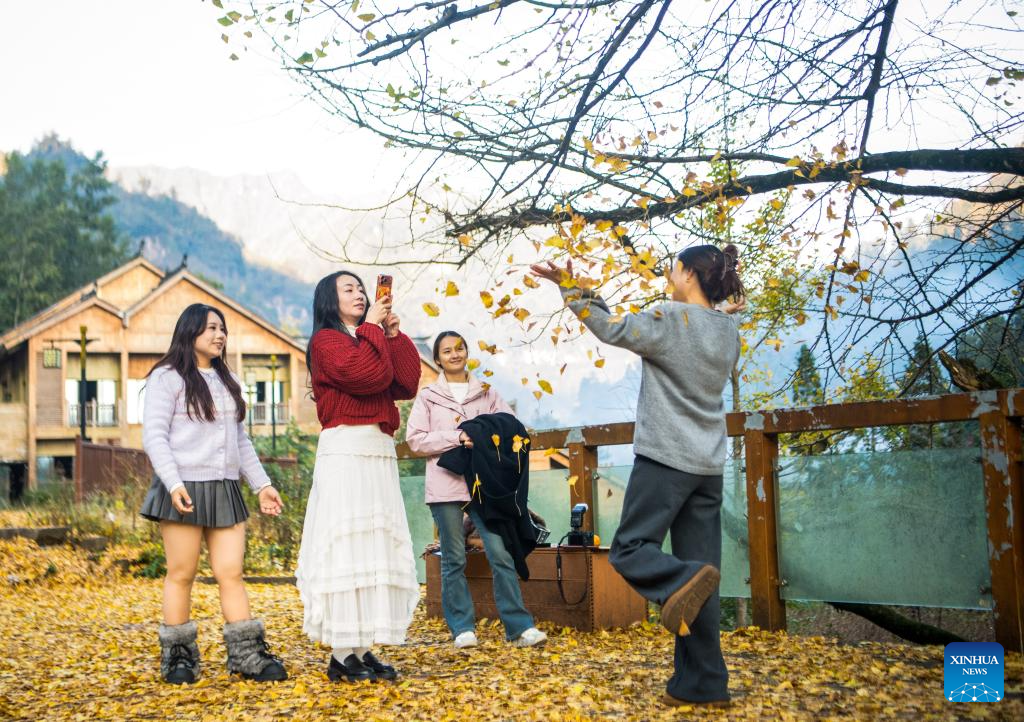 Tourists take photos in Zhongyi Township, Shizhu County, southwest China's Chongqing, Nov. 21, 2025. Located in Wuling Mountain area, Zhongyi Township in recent years has developed several characteristic industries so as to build a modern agricultural industrial system.