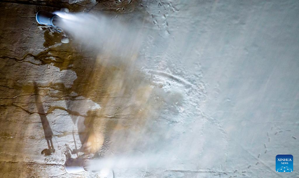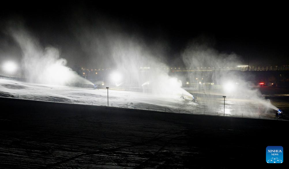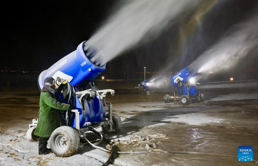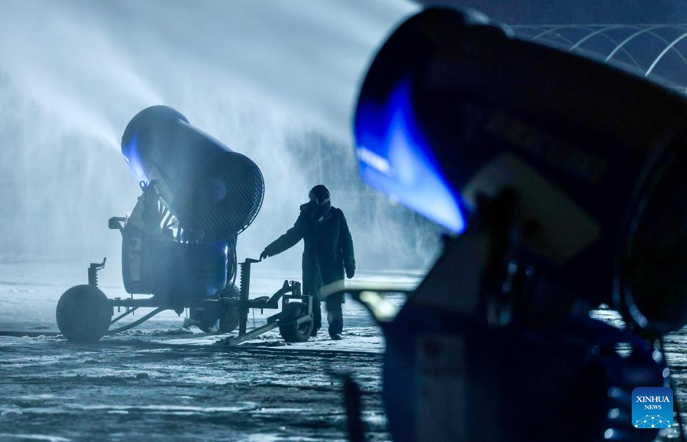 A staff member makes artificial snow at Yuehai ski resort in Yinchuan City, northwest China's Ningxia Hui Autonomous Region, Nov. 21, 2025. As the nighttime temperature continuously drops in Yinchuan, ski resorts in the city are busy shaping snow trails, debugging equipment, and making artificial snow, in preparation for the upcoming season of ice and snow tourism.