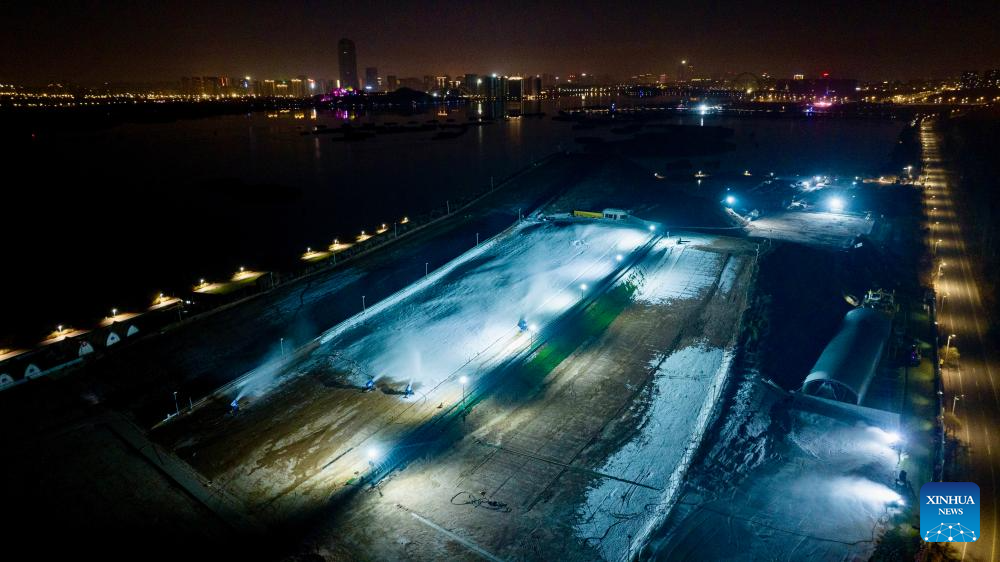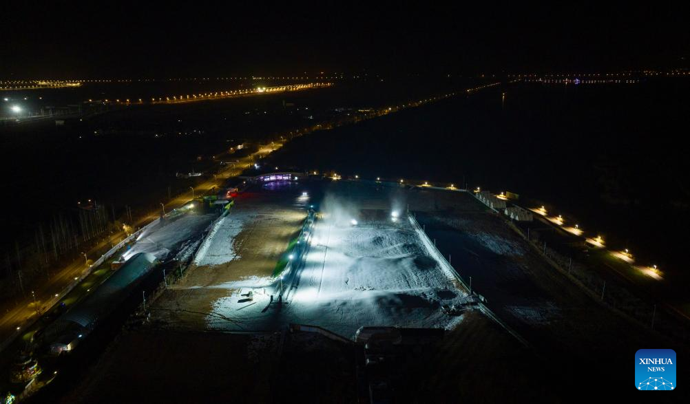 A drone photo taken on Nov. 21, 2025 shows staff members making artificial snow at Yuehai ski resort in Yinchuan, northwest China's Ningxia Hui Autonomous Region. As the nighttime temperature continuously drops in Yinchuan, ski resorts in the city are busy shaping snow trails, debugging equipment, and making artificial snow, in preparation for the upcoming season of ice and snow tourism.