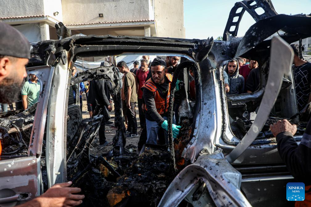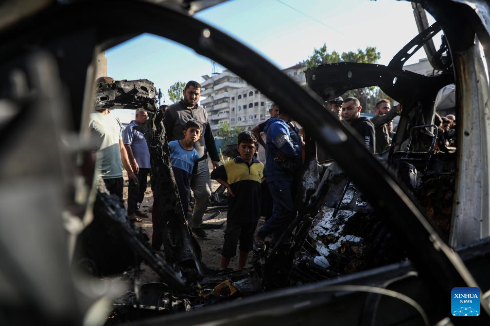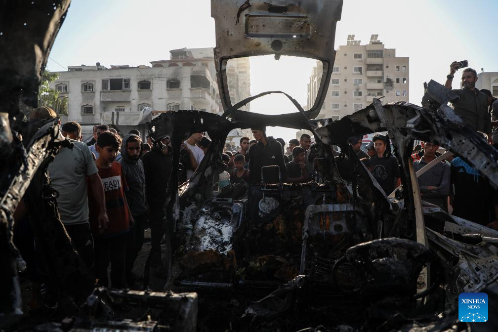 The strike, targeting a civilian vehicle near the Abbas Junction in the Rimal neighborhood, also injured several passersby and set the car on fire, eyewitnesses and medical sources told Xinhua. (Photo by Rizek Abdeljawad/Xinhua)