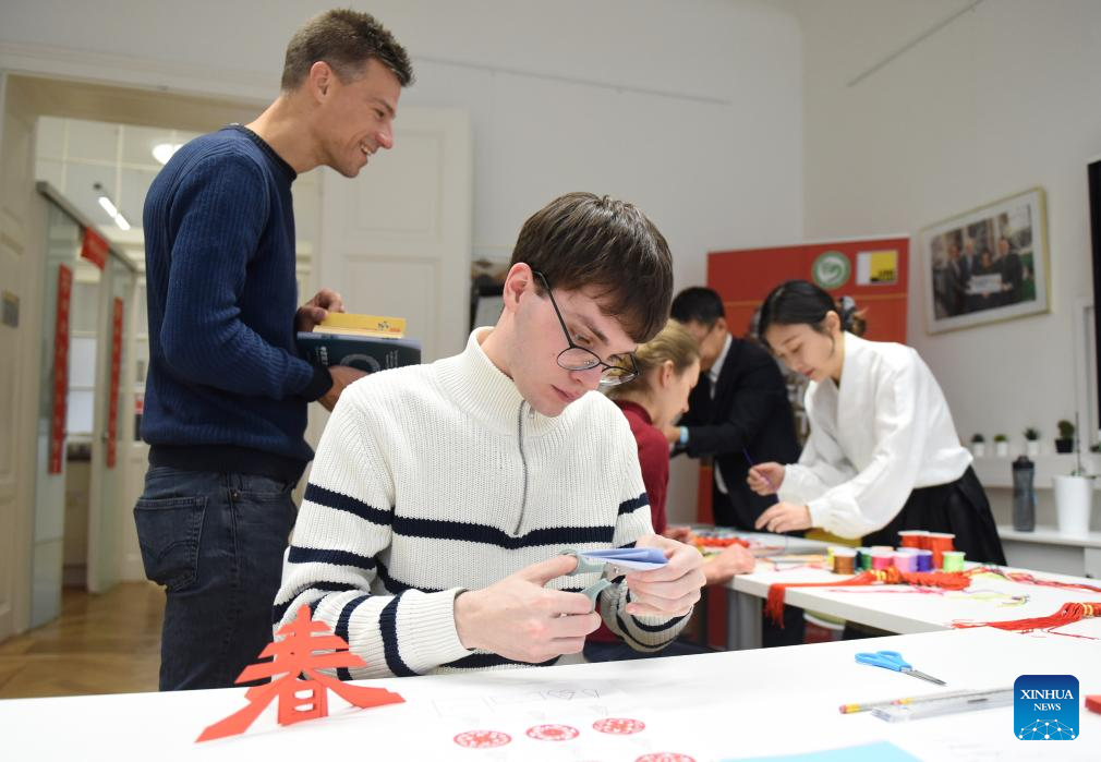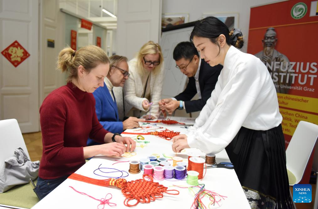 Guests try Chinese knot-making at a celebration event marking the 15th anniversary of the Confucius Institute of the University of Graz in Graz, Austria, Nov. 21, 2025. (Xinhua/He Canling)