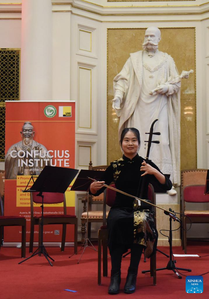 An actress plays Erhu, a traditional Chinese instrument, at a celebration event marking the 15th anniversary of the Confucius Institute of the University of Graz in Graz, Austria, Nov. 21, 2025. (Xinhua/He Canling)