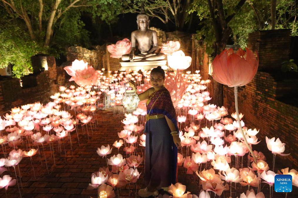 A woman poses for photo at Nasatta Park in Ratchaburi province, Thailand, Nov 21, 2025. The Nasatta Light Festival 2026: Winter Illumination started on Nov. 21, 2025, and will stay on until May 3, 2026. (Xinhua/Rachen Sageamsak)