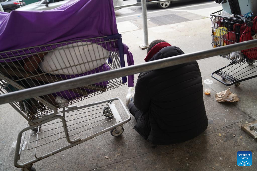A man sits by a street near a shelter for the homeless in New York, the United States, on Nov. 21, 2025. It is estimated that more than 350,000 people were without home in New York City (NYC) by August this year, the highest level since the Great Depression of the 1930s, according to the Coalition for the Homeless. Most of them slept in NYC shelters or temporarily doubled-up in the homes of others, and thousands slept unsheltered on streets, parks and subways. (Xinhua/Zhang Fengguo)