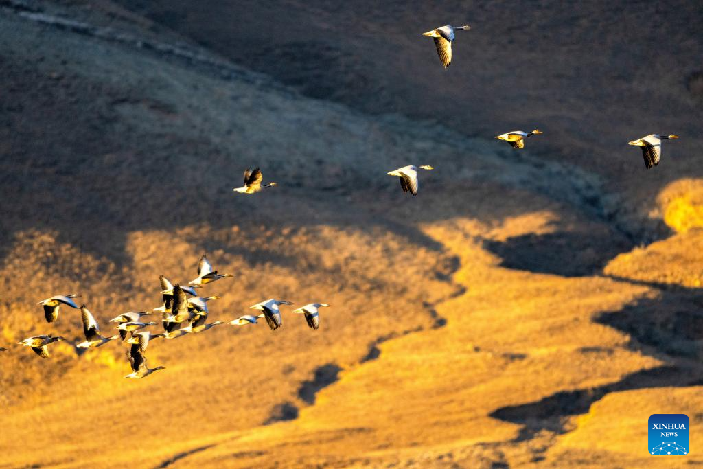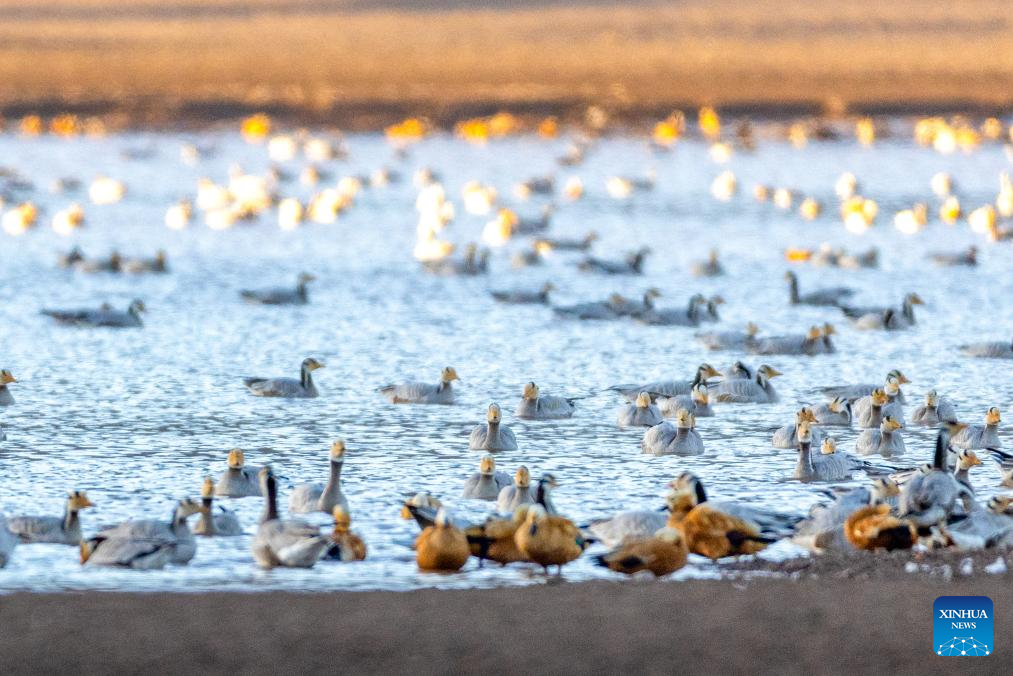 This photo taken on Nov. 23, 2025 shows migratory birds in Lhunzhub County of Lhasa, southwest China's Xizang Autonomous Region. (Xinhua/Jiang Fan)