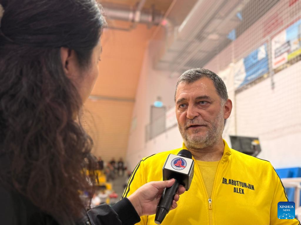 Alex Arutyunjan talks during an interview at the 2025 Hungarian Wushu Championships in Fot, a small town in the Budapest region, Hungary, on Nov. 22, 2025. (Xinhua/Chen Hao)