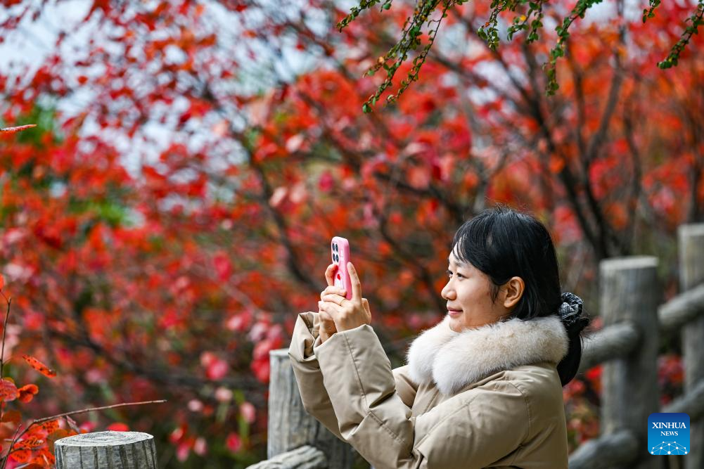 A tourist takes photos at a scenic spot near the Wuxia Gorge, one of the Three Gorges on the Yangtze River, in Wushan, southwest China's Chongqing, Nov. 23, 2025. (Xinhua/Wang Quanchao)