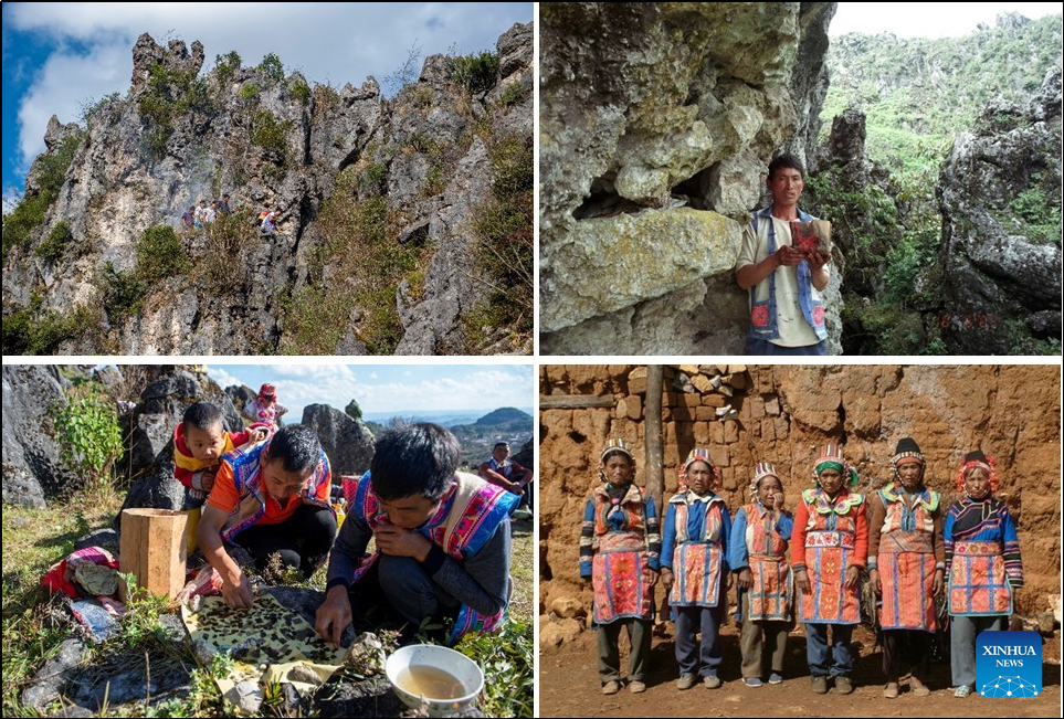 This combo file photo shows the scenes of life and sacrifice of modern Bo people in Qiubei County, southwest China's Yunnan Province. (Photo by Xie Peixia/Xinhua)