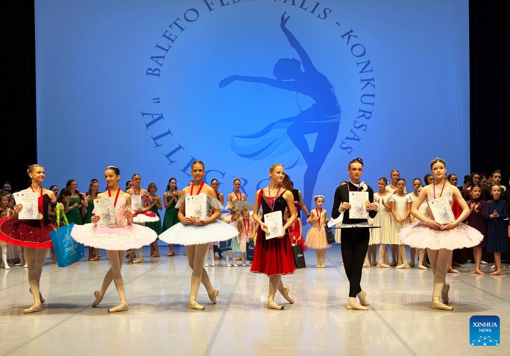 Performers receive awards during the International Ballet and Contemporary Dance Festival-Competition "ALLEGRO 2025" in Vilnius, Lithuania, on Nov. 23, 2025. Hundreds of dancers competed in the event held here from Nov. 22 to 23. (Xinhua/Xue Dongmei)