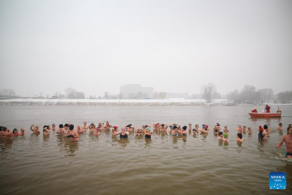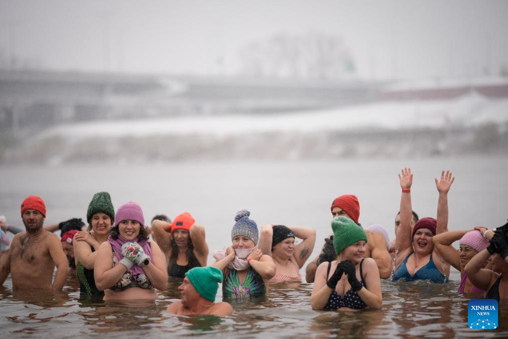 Winter swimming enthusiasts take a dip in the icy waters of the Vistula River in Warsaw, Poland, on Nov. 23, 2025. Sunday marked the opening of the cold-water swimming season in Warsaw. (Photo by Jaap Arriens/Xinhua)