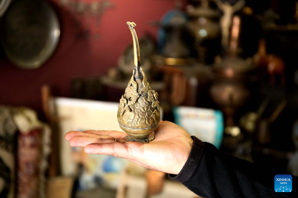 The owner of an antique shop displays his collection in a local culture market in Baghdad, Iraq, Nov. 24, 2025. (Xinhua/Khalil Dawood)