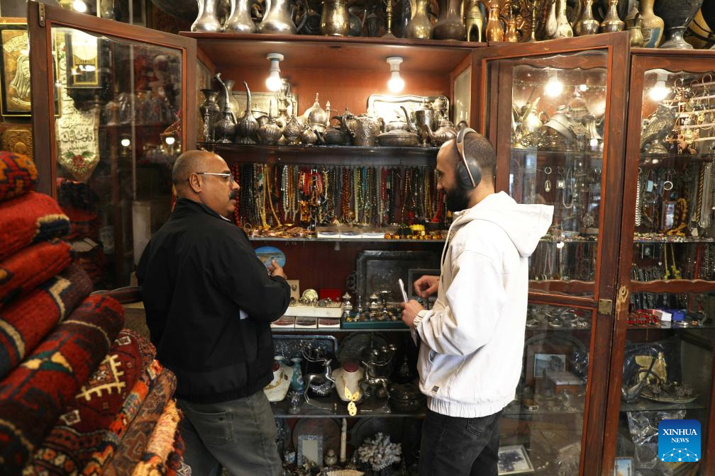 The owner of an antique shop displays his collections to a customer in a local culture market in Baghdad, Iraq, Nov. 24, 2025. (Xinhua/Khalil Dawood)