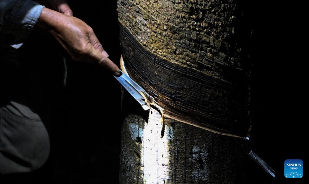 A farmer taps a rubber tree at Xingaofeng Village of Baisha Li Autonomous County, south China's Hainan Province, Nov. 19, 2025. In recent years, Baisha Li Autonomous County has been deeply tapping into the potential of namely rubber, tea and oil-tea camellia, three of its signature industrial crops, to boost local economy. Reports show that the planting area of the these crops in Baisha reached 1.1605 million mu (about 77,367 hectares) by 2014, with an output value of approximately 2 billion yuan (282.5 million U.S. dollars). (Xinhua/Yang Guanyu)
