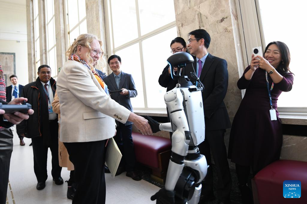 Tatiana Valovaya (front), director-general of the United Nations Office at Geneva, shakes hands with a robot before a high-level dialogue on AI governance entitled "Geneva Dialogue: Solidarity for AI Governance" at the Palais des Nations in Geneva, Switzerland, Nov. 25, 2025. The Permanent Mission of China in Geneva, together with the permanent missions of Pakistan and Zambia, has convened a high-level dialogue on AI governance entitled "Geneva Dialogue: Solidarity for AI Governance" at the Palais des Nations, home to the United Nations Office at Geneva, on Tuesday. (Xinhua/Lian Yi)
