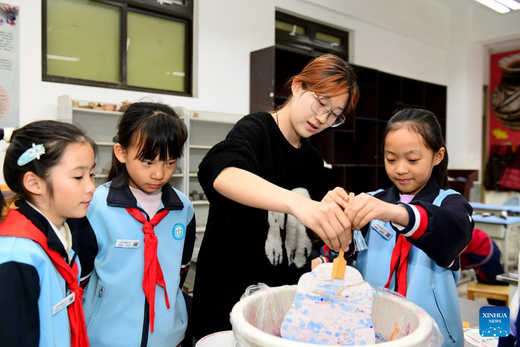 A teacher guides students to make lacquer fans at a primary school in Shizhong District of Jinan City, east China's Shandong Province, Nov. 25, 2025. In recent years, authorities in Shizhong District of Jinan City have been encouraging local schools to enhance aesthetic education by exposing their students to diverse arts-related extracurricular programs. (Xinhua/Guo Xulei)