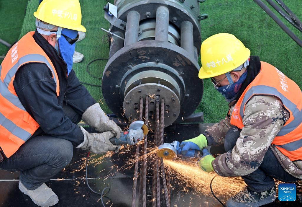 Constructors work at the construction site of twin swivel bridges of the Xinggang expressway in Tianjin, north China, Nov. 26, 2025. The twin swivel bridges of the Xinggang expressway completed their rotation here on Wednesday. Two continuous beams, each weighing 14,000 tons, simultaneously turned clockwise by more than 60 degrees to pass over a railway.