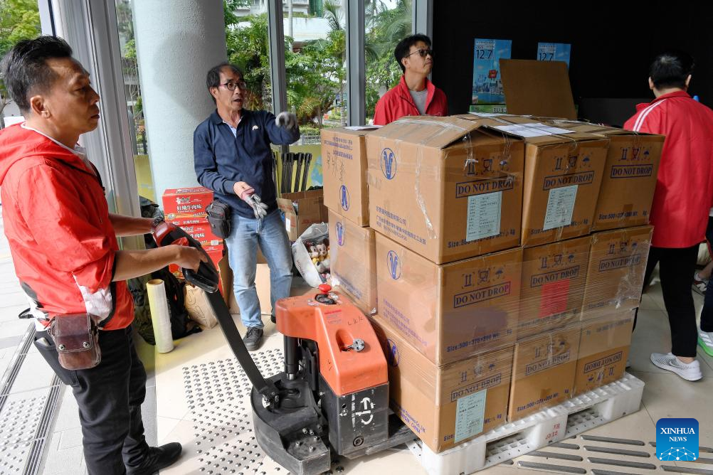 Staff members transfer relief materials donated by citizens at a community in Tai Po of Hong Kong, south China, Nov. 27, 2025. Three men have been arrested for suspected manslaughter in a fire that broke out in Wang Fuk Court, a residential area in Tai Po of Hong Kong, on Wednesday afternoon, the Hong Kong Police Force said at a press briefing on Thursday.