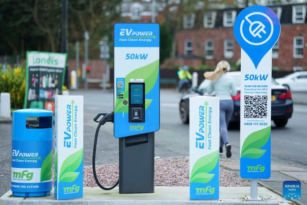 A charging station is seen in Manchester, Britain, Nov. 26, 2025. British Chancellor of the Exchequer Rachel Reeves unveiled the 2025 Budget on Wednesday, pledging that the government will neither return the country to austerity nor allow public spending and borrowing to spiral, while vowing to ease pressures on the cost of living.