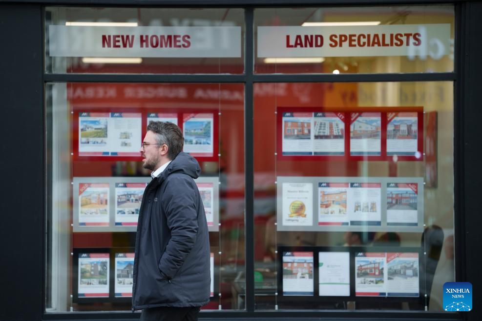 A man walks past an estate agent in Manchester, Britain, Nov. 26, 2025. British Chancellor of the Exchequer Rachel Reeves unveiled the 2025 Budget on Wednesday, pledging that the government will neither return the country to austerity nor allow public spending and borrowing to spiral, while vowing to ease pressures on the cost of living.