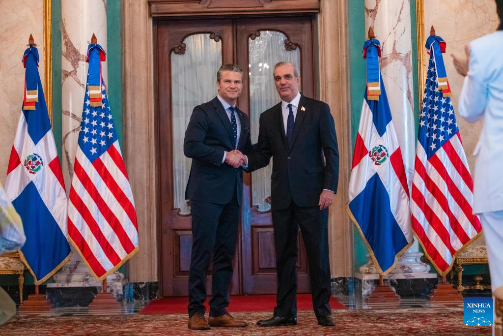 Dominican President Luis Abinader (R) meets with visiting U.S. Defense Secretary Pete Hegseth in Santo Domingo, the Dominican Republic, Nov. 26, 2025. The Dominican Republic will allow the United States to use restricted areas of the San Isidro Air Base and Las Americas International Airport to combat drug trafficking, said President Luis Abinader on Wednesday. (Presidency of the Dominican Republic/Handout via Xinhua)
