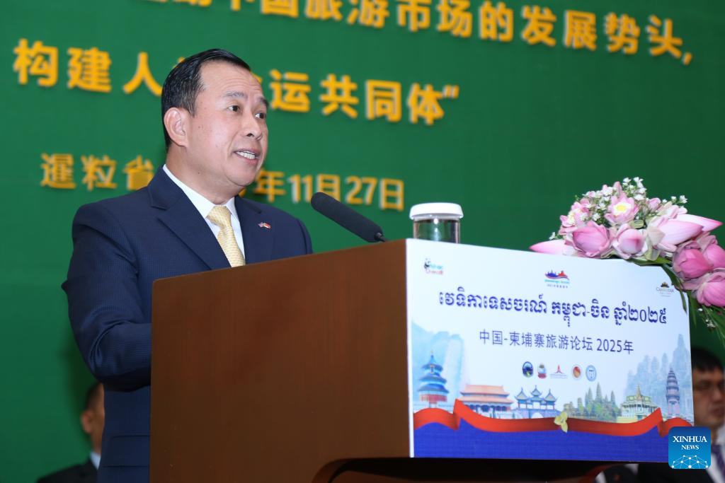 Cambodian Tourism Minister Huot Hak speaks at a Cambodia-China tourism forum in Siem Reap province, Cambodia on Nov. 27, 2025. Cambodia attracted about 1 million Chinese tourists during the January-October period of 2025, the country's Tourism Minister Huot Hak said here on Thursday. (Photo by Sao Khuth/Xinhua)