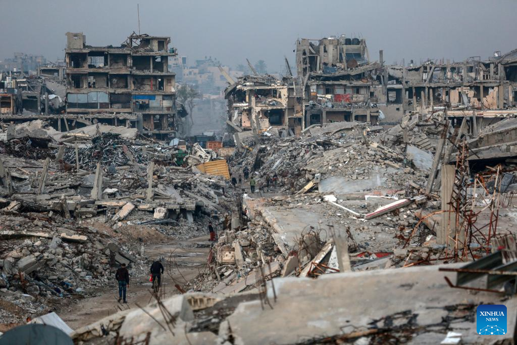 People walk among rubbles in the Zeitoun neighborhood, southeast of Gaza City, Nov. 27, 2025. (Photo by Rizek Abdeljawad/Xinhua)