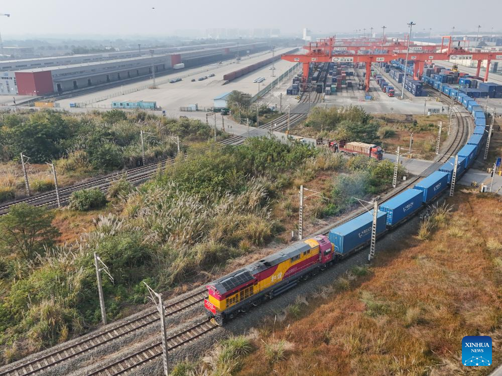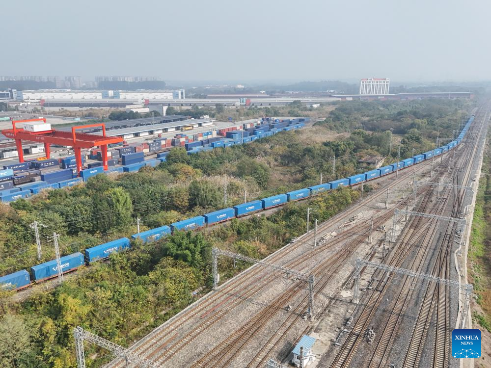An aerial drone photo taken on Nov. 28, 2025 shows the X8086 China-Europe freight train departing from the Chengdu International Railway Port in Chengdu, southwest China's Sichuan Province. As the X8086 train departed from Chengdu on Friday, the total number of China-Europe freight train trips has surpassed 120,000, with the total value of goods transported exceeding 490 billion U.S. dollars. (Xinhua/Wang Xi)