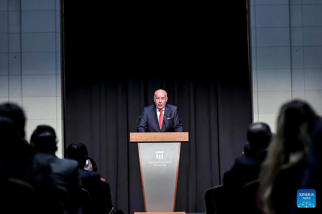 Hungarian President Tamas Sulyok speaks during the opening ceremony of the exhibition "Civilization of the Qin and Han Dynasties - The First Chinese Emperor's Terracotta Warriors" in Budapest, Hungary, Nov. 27, 2025. The Museum of Fine Arts in Budapest on Thursday opened one of the most significant Chinese cultural exhibitions ever held in Hungary, presenting more than 150 ancient artworks from the Qin and Han dynasties (221 BC-220 AD), including ten original Terracotta Warriors.