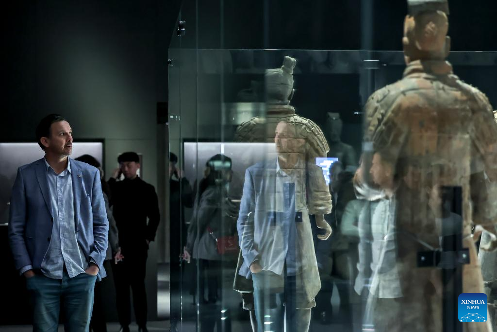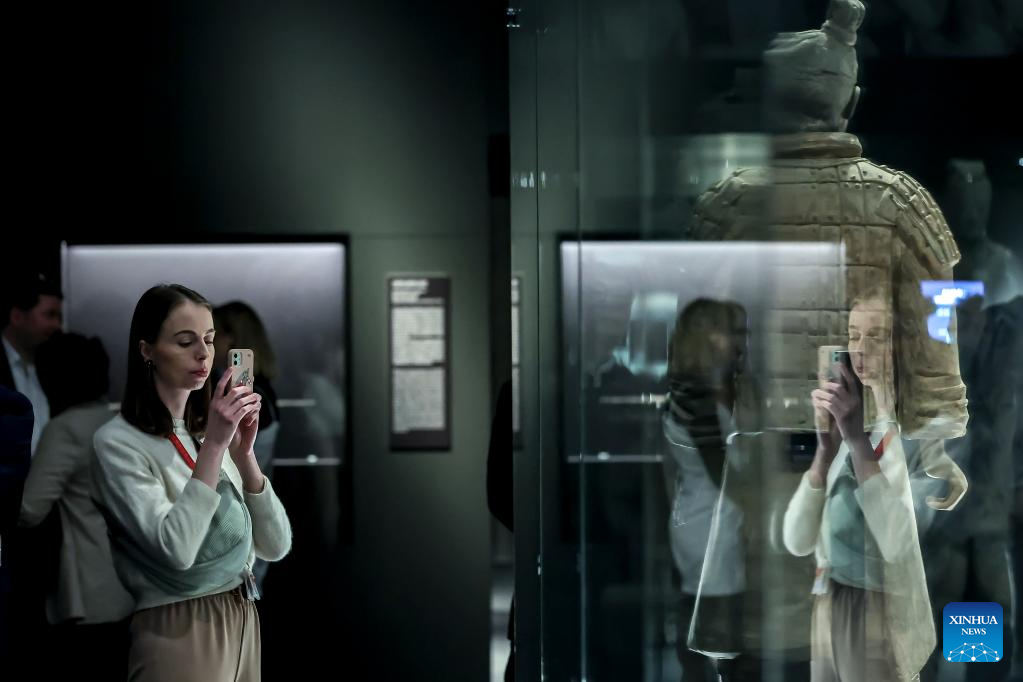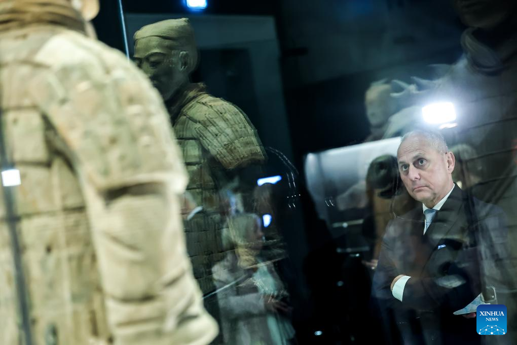 A visitor views exhibits at the exhibition "Civilization of the Qin and Han Dynasties - The First Chinese Emperor's Terracotta Warriors" at the Museum of Fine Arts in Budapest, Hungary, Nov. 27, 2025. The Museum of Fine Arts in Budapest on Thursday opened one of the most significant Chinese cultural exhibitions ever held in Hungary, presenting more than 150 ancient artworks from the Qin and Han dynasties (221 BC-220 AD), including ten original Terracotta Warriors. Titled "Civilization of the Qin and Han Dynasties - The First Chinese Emperor's Terracotta Warriors," the exhibition is jointly organized by the Museum of Fine Arts in Budapest and the Shaanxi Provincial Cultural Heritage Administration, and it will run for six months starting from Friday. (Photo by David Balogh/Xinhua)